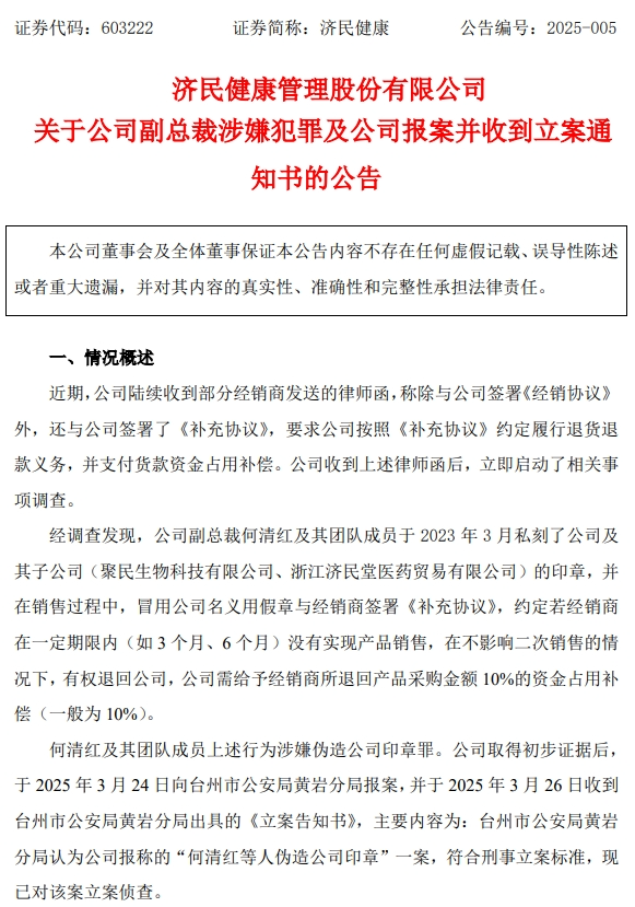 济民健康表示,何清红及其团队成员上述行为涉嫌伪造公司印章罪。公司取得初步证据后,于3月24日向台州市公安局黄岩分局报案,并于3月26日收到台州市公安局黄岩分局出具的《立案告知书》,黄岩分局现已对该案立案侦查。