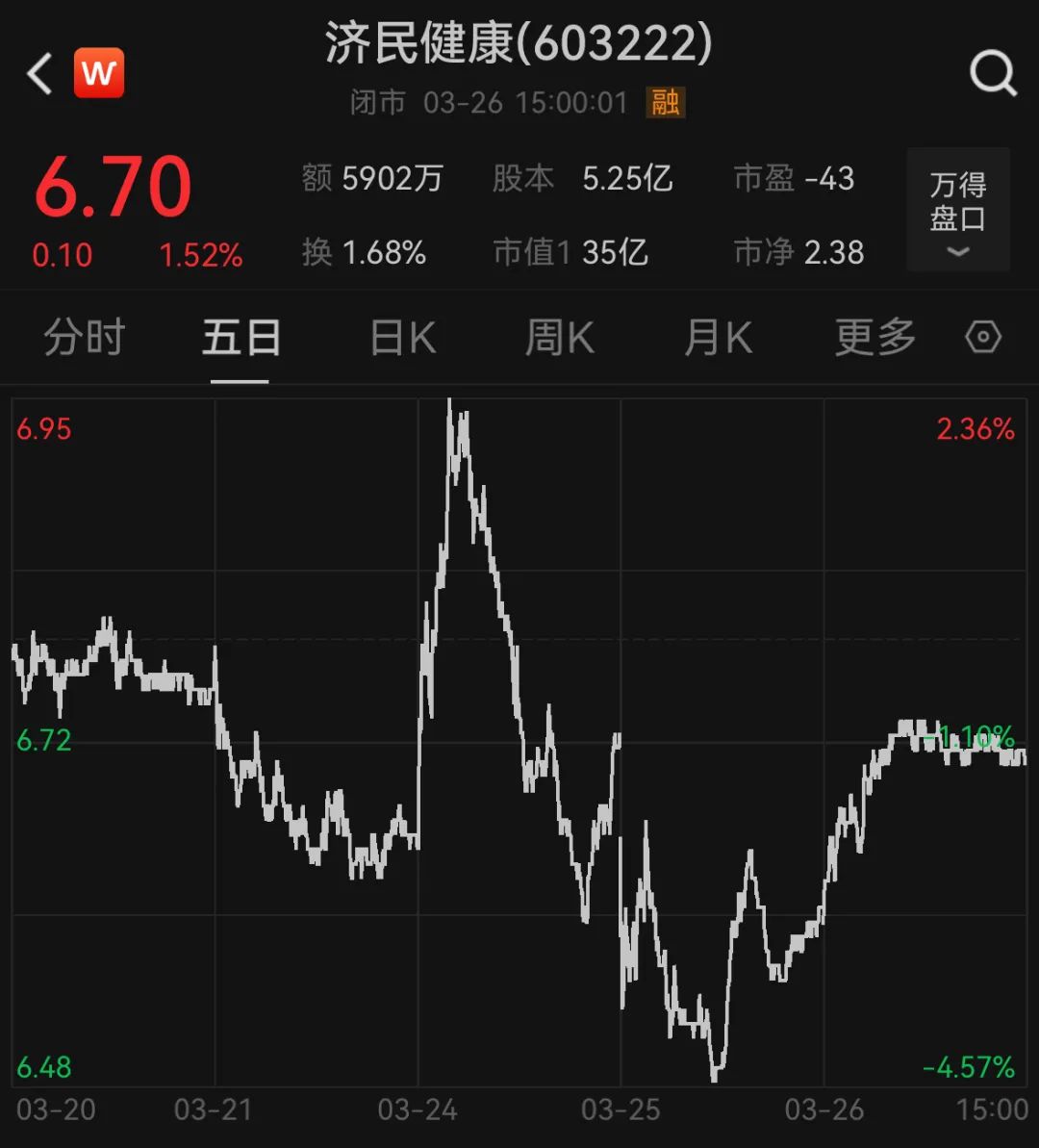 截至3月26日收盘,济民健康涨1.52%,报6.7元/股,总市值35.18亿元。
